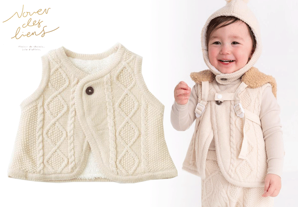 ベビーニットベストは、裏側ボア仕様で暖かく柔らかな仕上がり。