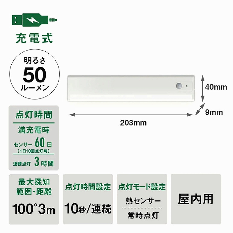 厚さわずか7mm、重さ75gという超薄型デザインに、感度の高い人感センサーを搭載。