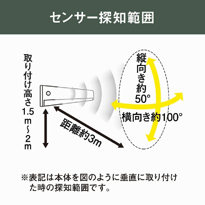 最大3m・100°の広範囲を検知し、玄関や廊下、階段など暗がりをやさしく照らします。