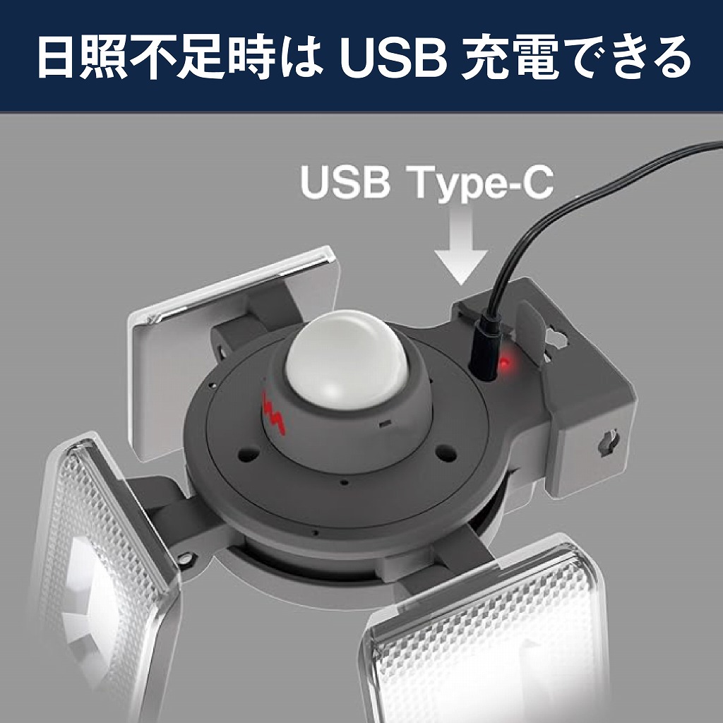 そんなときはUSBを使って充電でき、安定した点灯を維持できるソーラー式センサーライトなので安心です。