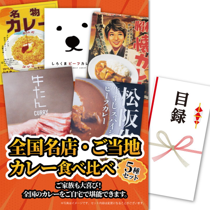 全国の名店やご当地のカレー5種類をご自宅で食べ比べできるパネル付き目録。