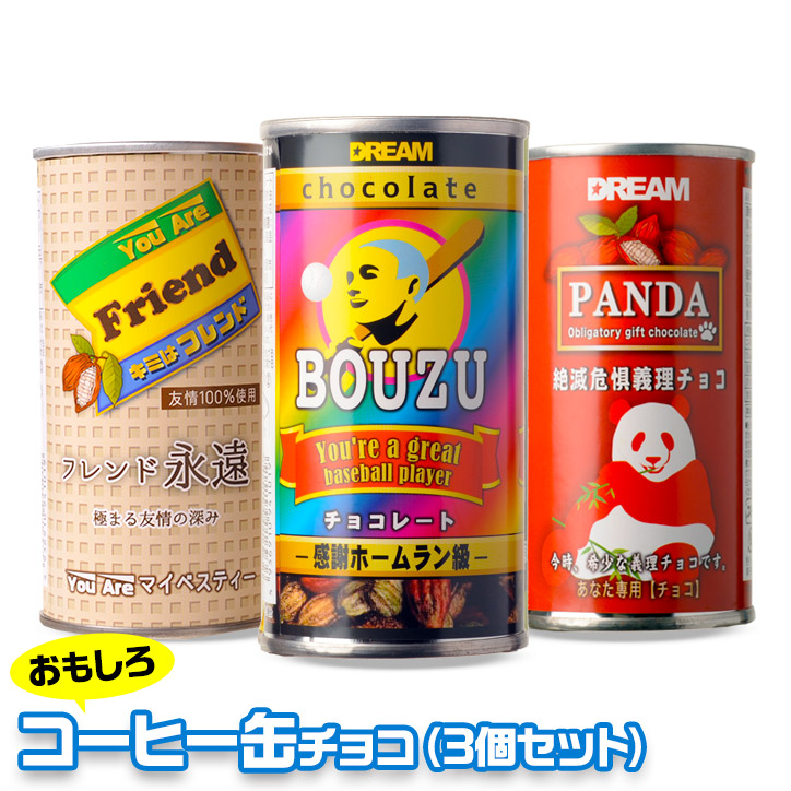 コーヒー缶風のユニークな缶入りチョコレート3本セット。缶の中にはクランチチョコが3個入っています。バレンタインの義理チョコ、ホワイトデーのお返しやギフトにおすすめです。