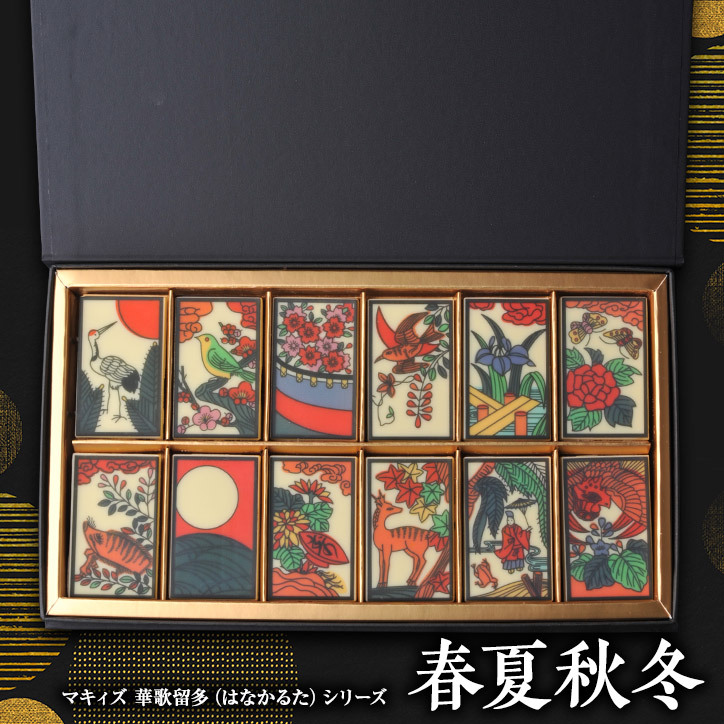 本物の花札と見間違うような花札のチョコレートギフトセット。絵札12枚(ホワイトチョコ)、チョコ札12枚(カカオ60のダークチョコ)がシックなパッケージに入っています。箱を開けた時の驚く顔が目に浮かびそうですね。