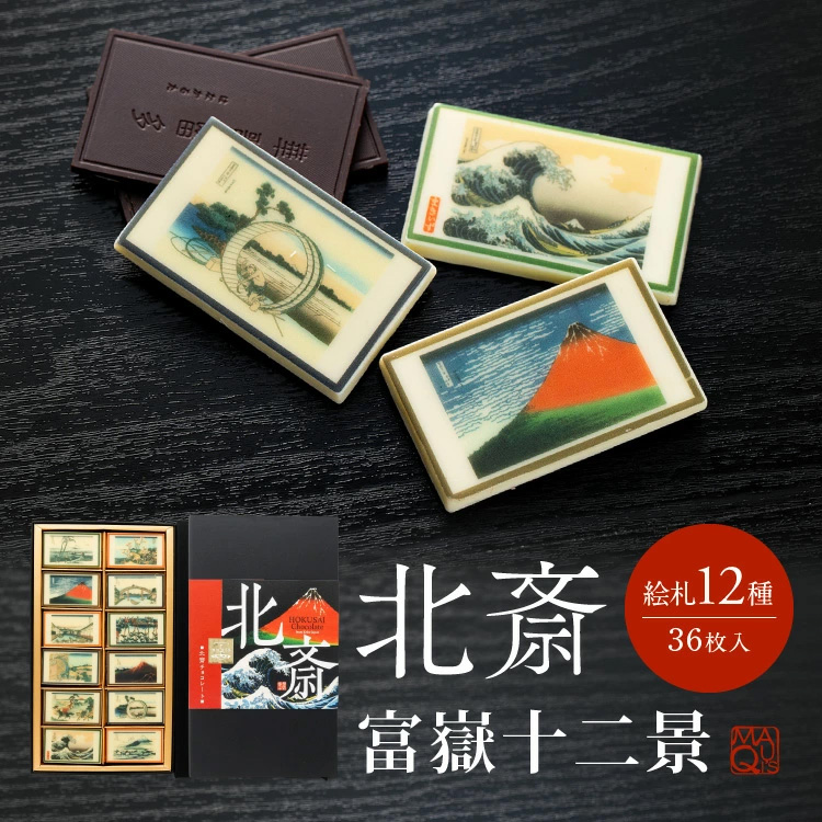 葛飾北斎の代表作富嶽三十六景は富士山を様々な地域や角度から描いた46図からなる錦絵です。三十六景の中から駿州江尻、東海道品川御殿山ノ不二、凱風快晴、深川万年橋下、江戸日本橋、東海道程ヶ谷、隠田の水車、山下白雨、隅田川関谷の里、尾州不二見原、神奈川沖浪裏、相州梅澤左の十二景のホワイトチョコ各1枚とダークチョコ24枚、合計36枚のセットです。