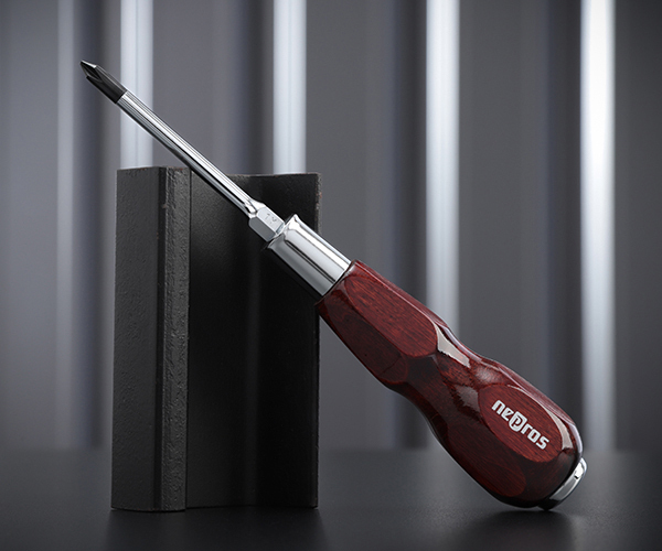 回しやすく力を加えやすい、手になじむ木柄ドライバー。