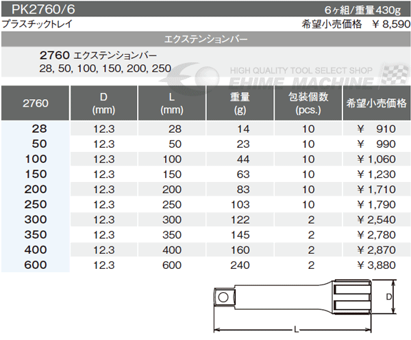 コーケン PK2760/6 エクステンションバーセット (トレイ付) 差込角6.3mm Ko-ken 工具 山下工業研究所