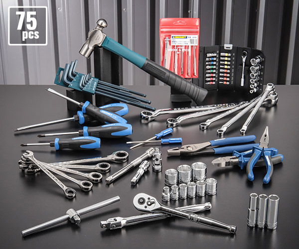 ・3/8DRラチェットハンドル(72ギア)+ソケット類に加え、レンチ・プライヤー・ドライバー・ハンマーまでフル装備