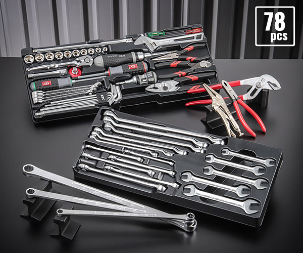 従来の工具セットでは2段目まで使っていた内容をトップと上段に集約した、拡張性の高い充実入組み78点ハイエンドツールセットです。