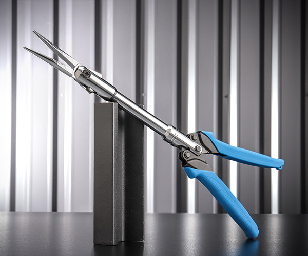 一般的なロングリーチ系(例:KNIPEX 2871-280)や、シグネットのロングノーズプライヤー 90226は奥に届く一方、エンジンルームなどではハンドルが干渉して先端を大きく開けない場面があります。そこで、MARVEL(マーベル)製造で知られるミノル工業とシグネットが協議を重ね、「先端部のみが開閉する」特殊機構を採用。狭く深い場所でも先端を開きやすく、しっかりつかむ作業性を高めました。