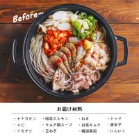 | 原材料 | テナガダコ、牛小腸、玉ネギ、白菜キムチ、エビ、イカ下足、春雨、トック、白ネギ、唐辛子、ニンニク/調味料(アミノ酸)、酒精、増粘剤(アルギン酸Na)、酸化防止剤(V.C)、(一部にえび・いか・牛肉・りんごを含む) キムチ鍋スープ(別添):(一部にえび・小麦・牛肉・大豆・鶏肉・りんごを含む) インスタント麺(別添):(一部に小麦・卵・大豆を含む) |