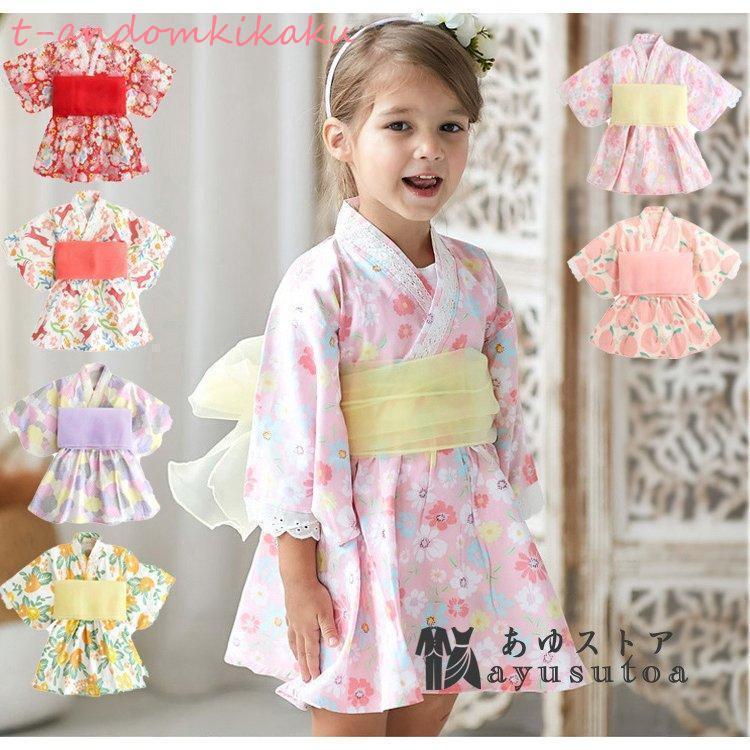2点セット 浴衣ドレス+帯 浴衣セット 子供浴衣 6カラー ふわふわ ゆかた こども用 子ども こども ゆかたドレス 90cm 100cm 110cm 120cm 130cm