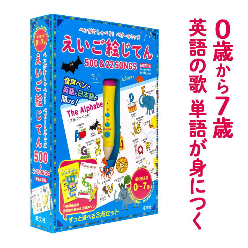 小学校低学年までに覚えるべき、500英単語や100フレーズをタッチペンでネイティブ音声と一緒に覚えられます。さらに子供たちが大好きな英語の歌22曲を収録。