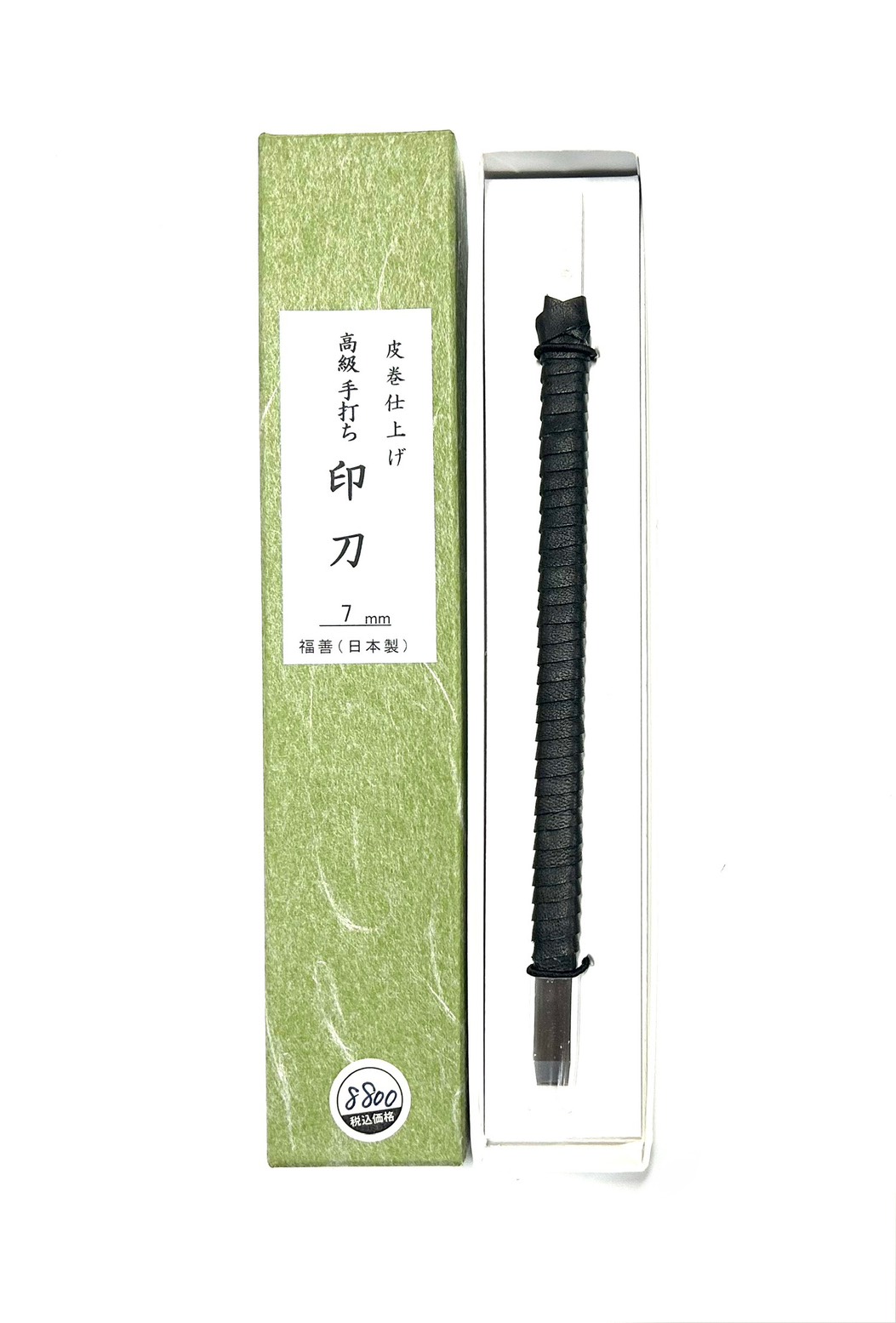 熟練した刃金職人による高級手打印刀です。材質は、切れ味を良くするため鉄の間に特殊刃物鋼を使用しております。抜群の切れ味(彫り)で、どのような石印材でもよく彫れます。革巻き仕様で手になじみ彫りやすい篆刻刀です。