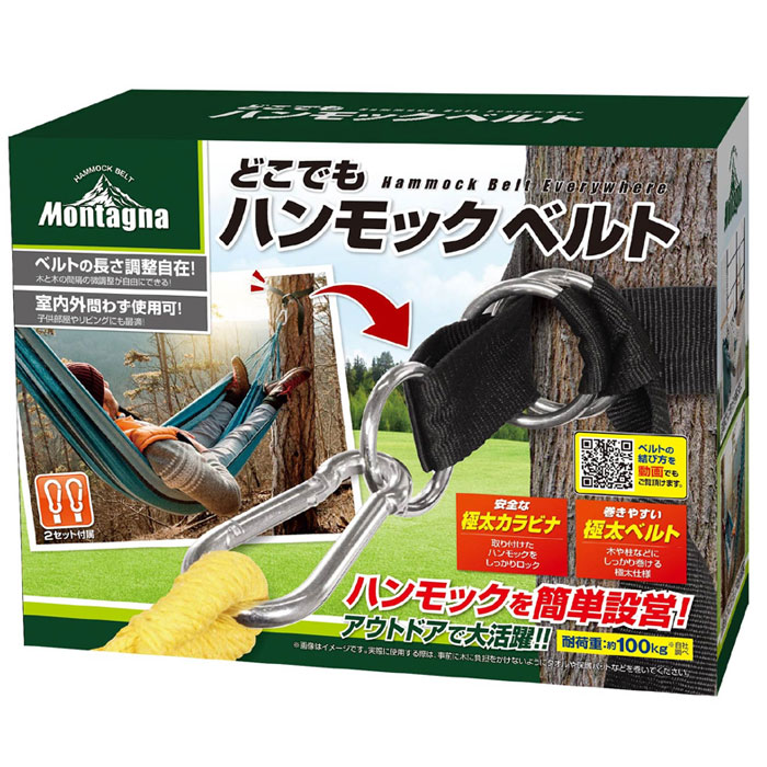 ■樹木の間隔に合わせてベルト長さを調整可能で、極太カラビナでハンモックをしっかりと固定します。