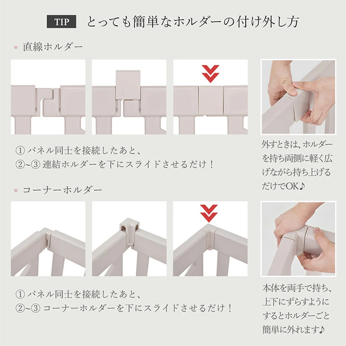 コーナーパーツで接続されている【サークルパネル本体】の片方を手で押さえ、 もう片方の【サークルパネル】を引き上げることでコーナーパーツごと簡単に外すことができます。