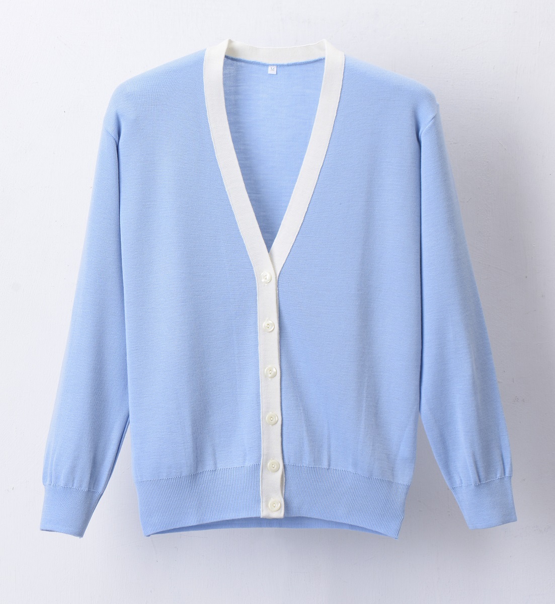 優しく軽やかな印象の襟元バイカラー、柔らかな色彩のバリエーション!抗ピル加工で毛玉になりにくいカーディガン。