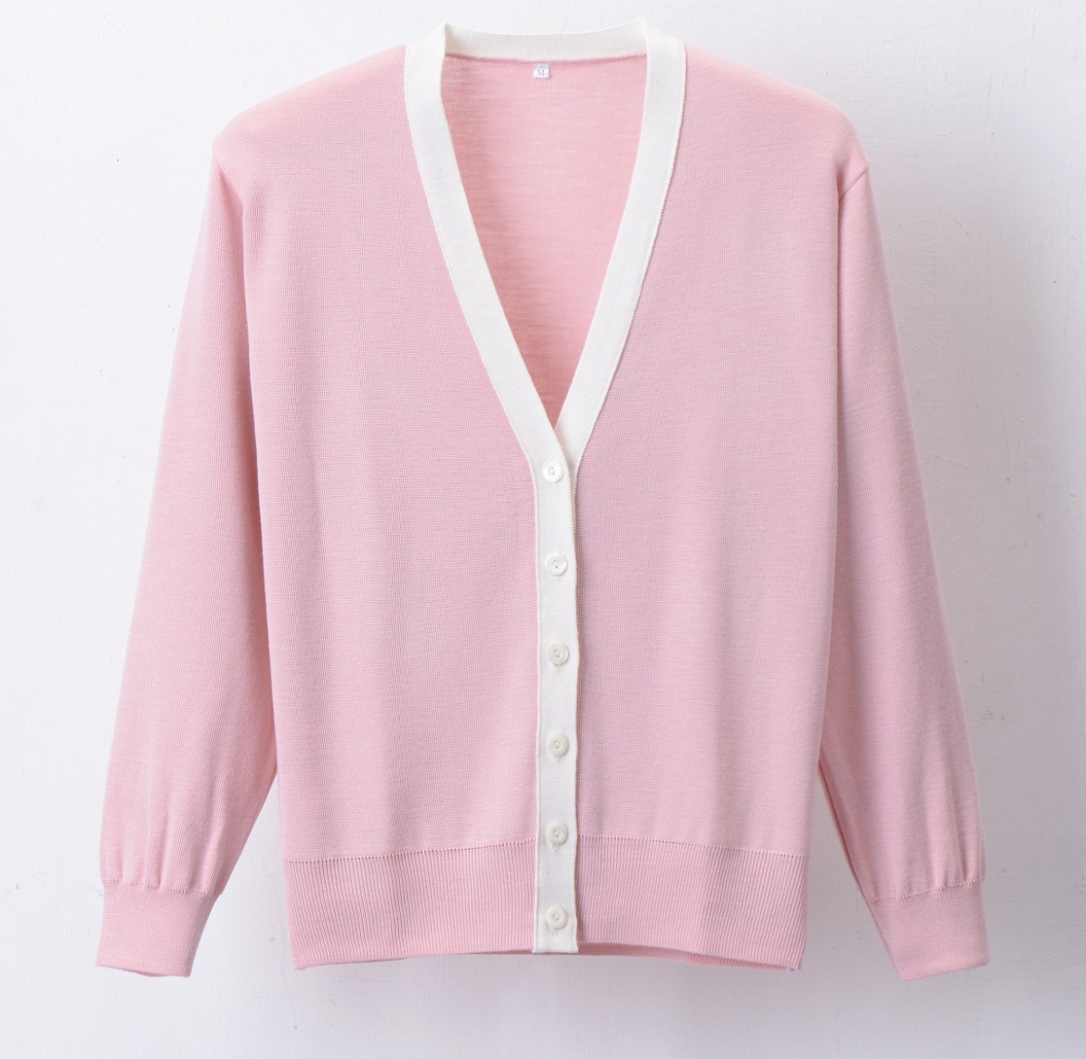 優しく軽やかな印象の襟元バイカラー、柔らかな色彩のバリエーション!抗ピル加工で毛玉になりにくいカーディガン。