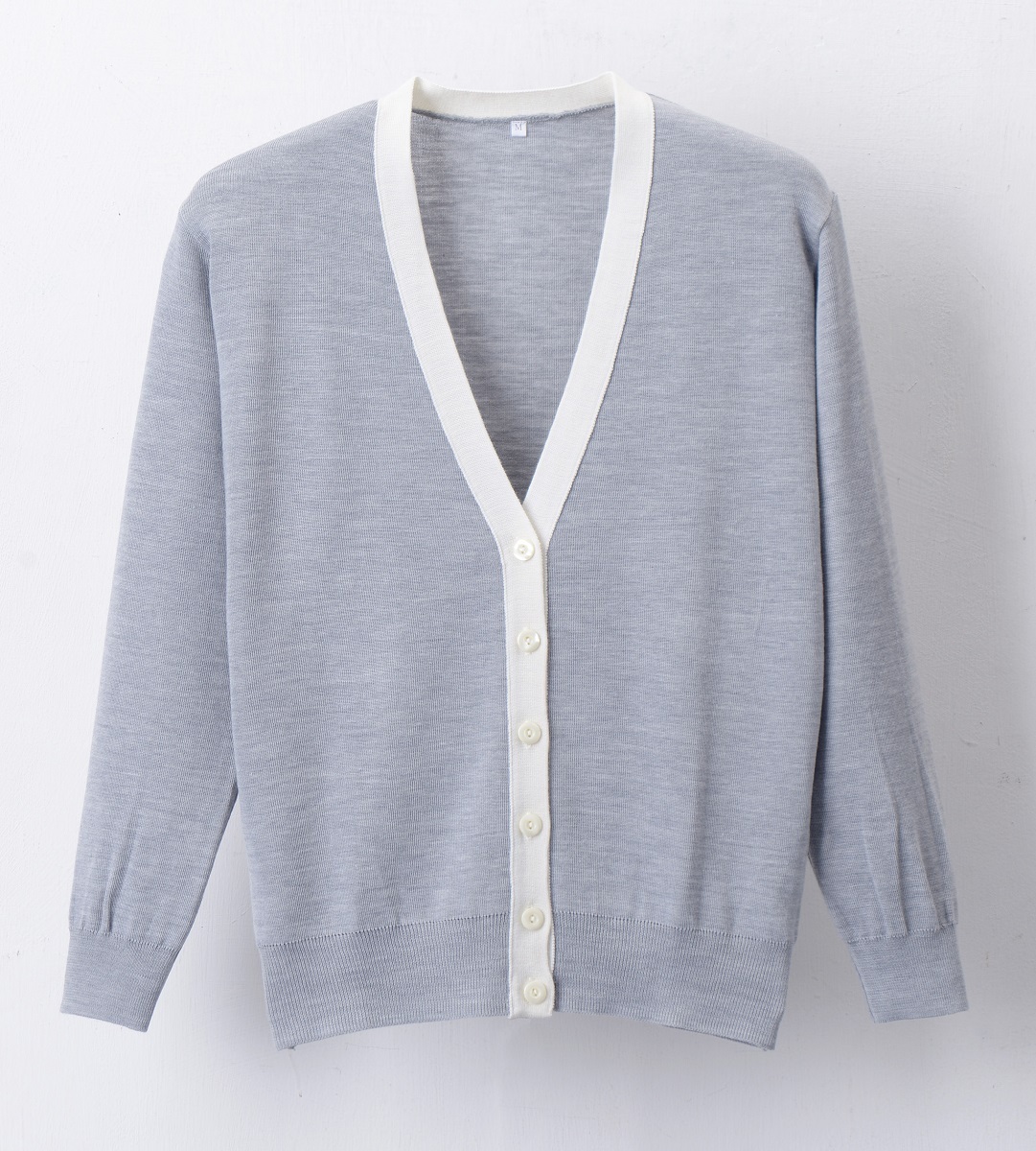 優しく軽やかな印象の襟元バイカラー、柔らかな色彩のバリエーション!抗ピル加工で毛玉になりにくいカーディガン。