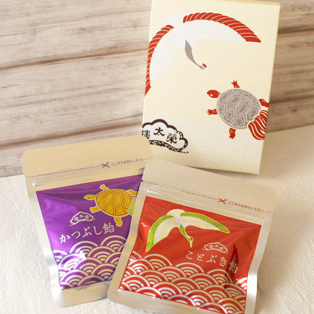梅ぼ志飴をおめでたい亀甲形の「ことぶき飴」に、黒飴を縁起のよい鰹節形の「かつぶし飴」をセットにした贈り物に最適な商品です。