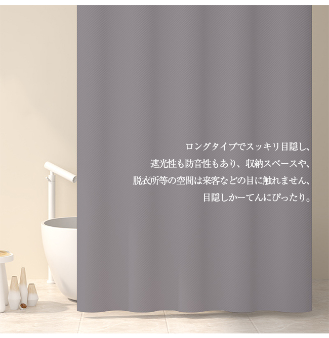 ・ロングタイプでスッキリ目隠し、遮光性も防音性もあり、収納スベースや、脱衣所等の空間は来客などの目に触れません、目隠しかーてんにぴったり。