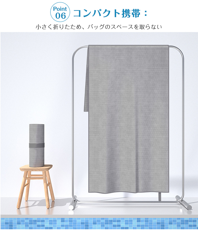 高吸収・速乾機能を備えたタオル。ジム・旅行・アウトドアに最適です。