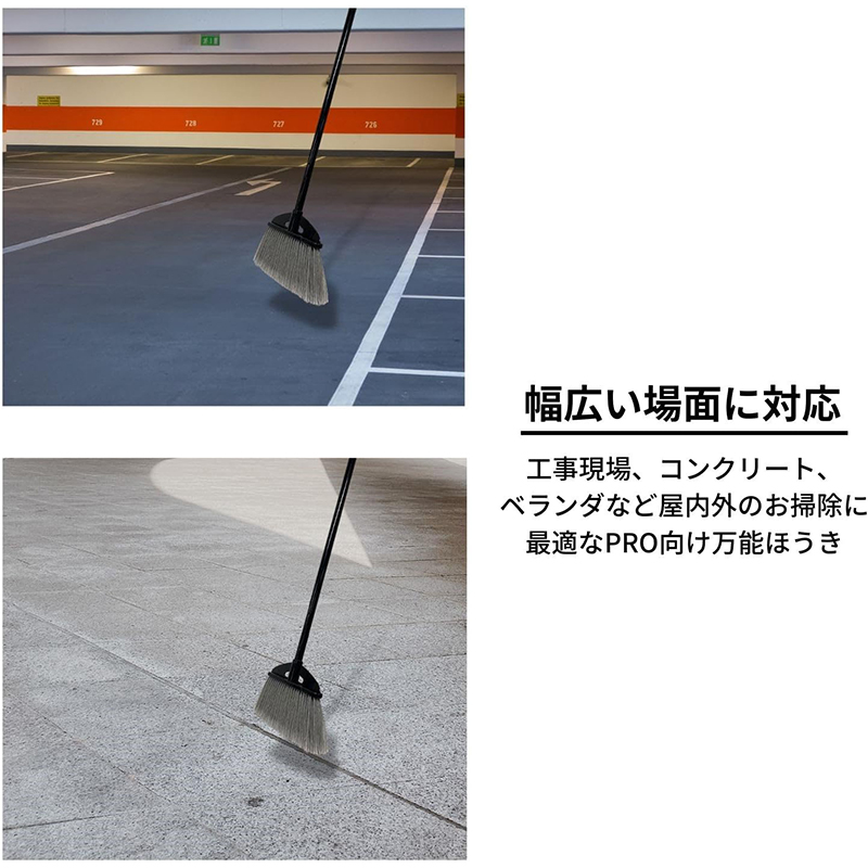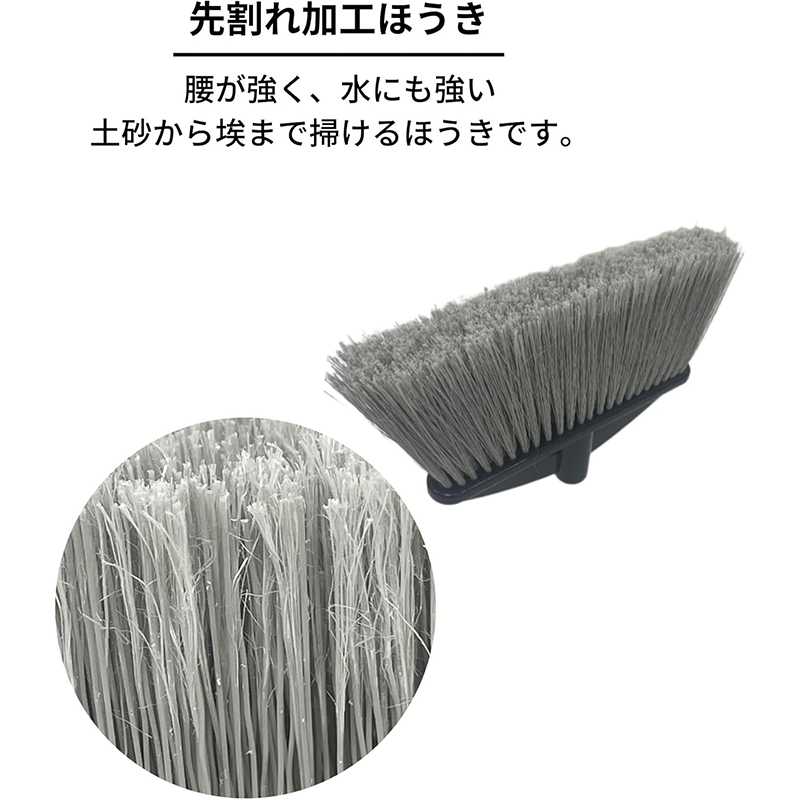 業務用ほうきとして最適。腰が強く・水気に強く・土砂から埃まで掃ける先割れ加工Crimp毛をブラシ植毛。