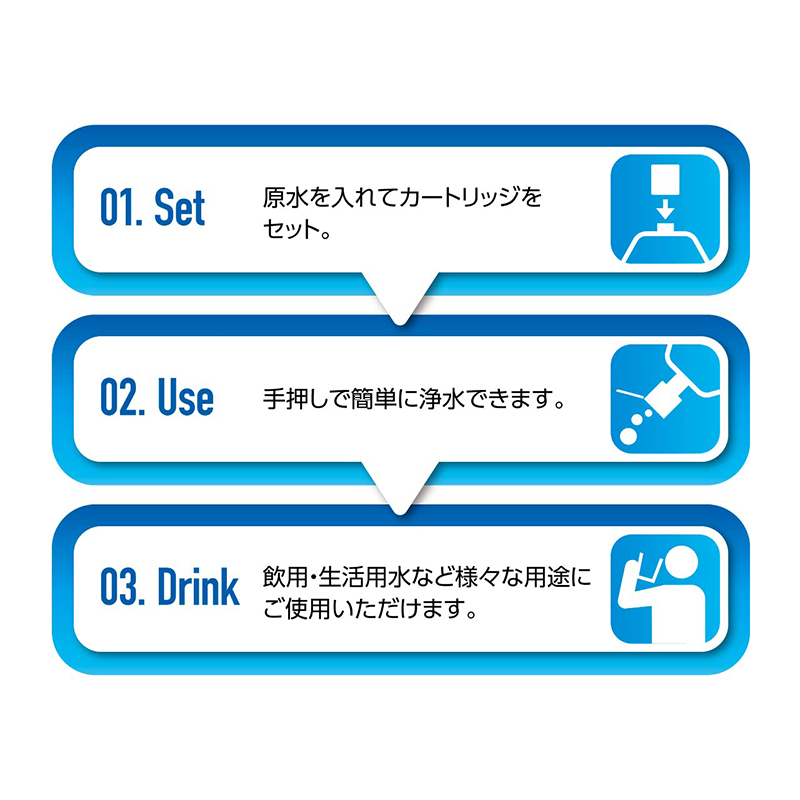 デリオスの携帯浄水器があれば、中空糸膜フィルターが細菌や原虫嚢子をしっかり除去し、安心安全で清潔な飲料水へとろ過します。