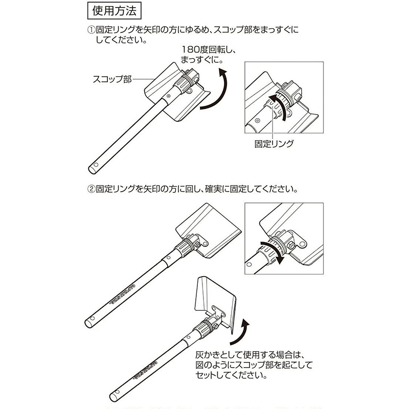 スコップと灰かき、使い方二通り。