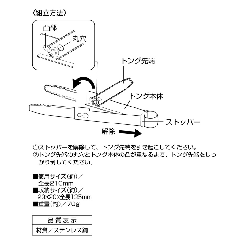 収納ストッパー付きでトングが開かずにすっきり収納できます。