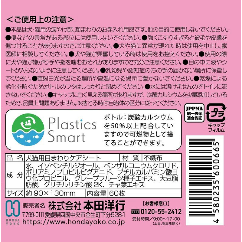 <本田洋行 なでなで 目やにケアシート 60枚入 無香料 犬猫用 大容量 厚手 お手入れ>
