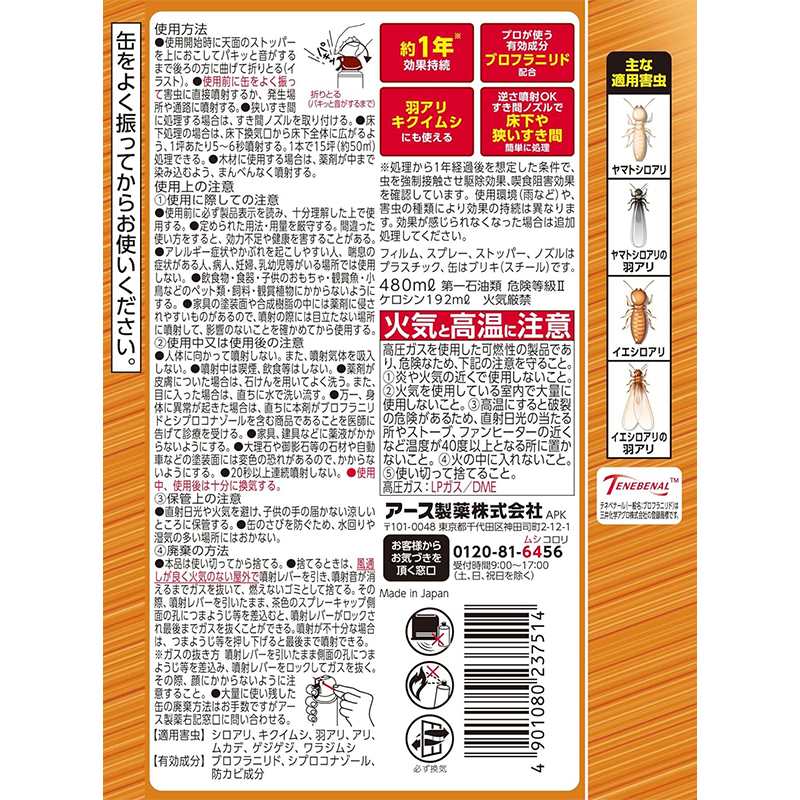 (適用害虫)シロアリ、キクイムシ、羽アリ、アリ、ムカデ、ゲジゲジ、ワラジムシ