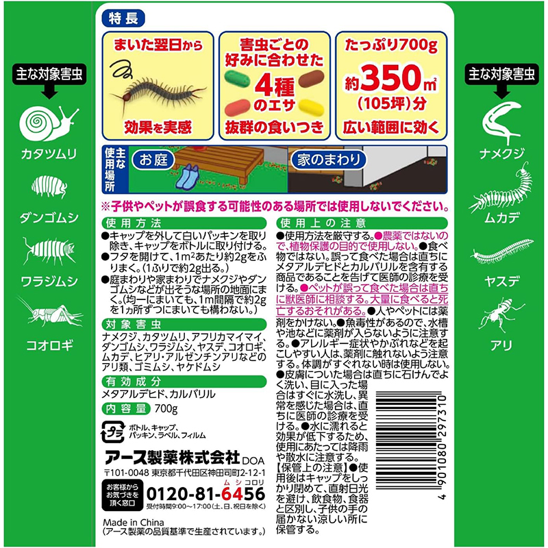 【対象害虫】ナメクジ、カタツムリ、アフリカマイマイ、ダンゴムシ、ワラジムシ、ヤスデ、コオロギ、ムカデ、ヒアリ・アルゼンチンアリなどのアリ類、ゴミムシ、ヤケドムシ