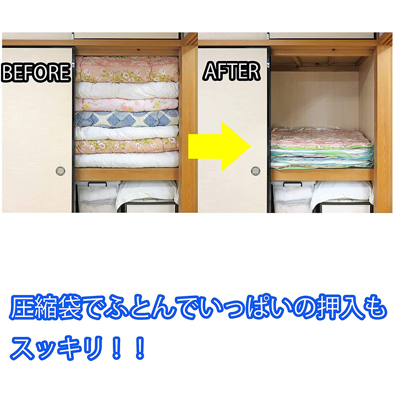 ・掛けふとんと敷きふとんをひとまとめにできるジャンボサイズの圧縮パックです。