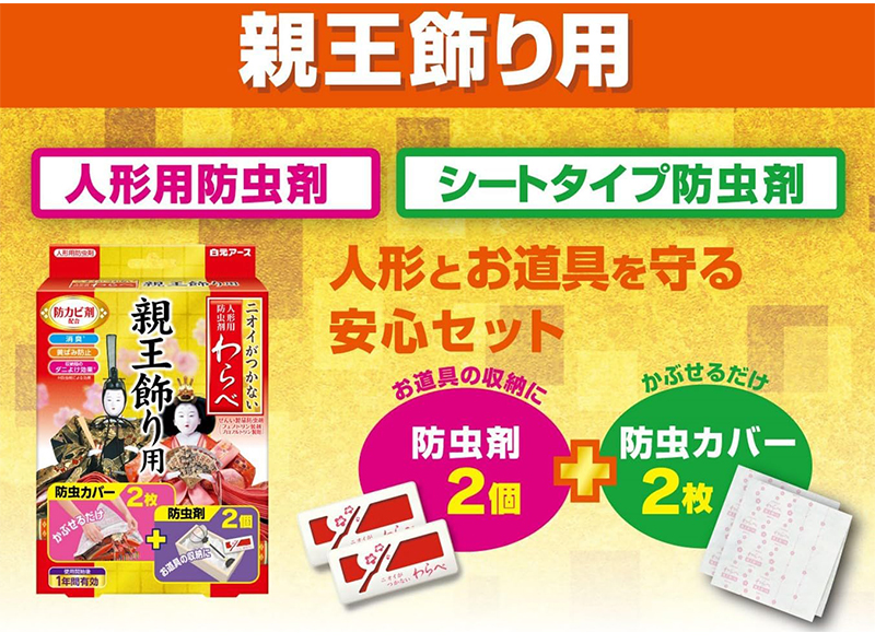 ニオイがつかない防虫成分が、大切な人形やお道具類をせんいの虫から守ります。