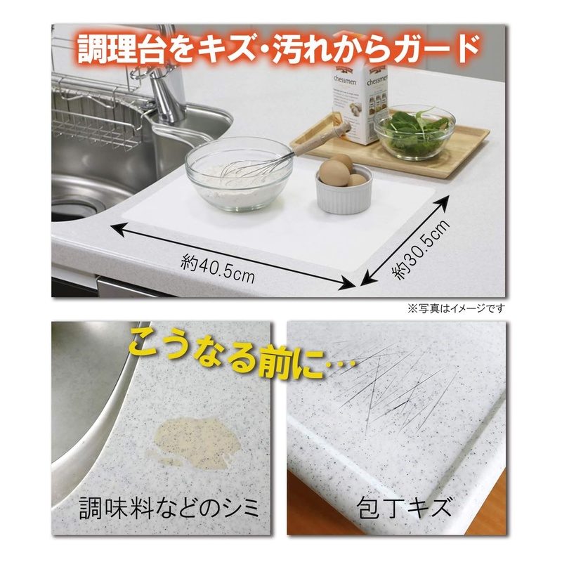 調理台に使われている人工大理石やタイル、ステンレス等のキッチンカウンターの汚れやキズを防止。