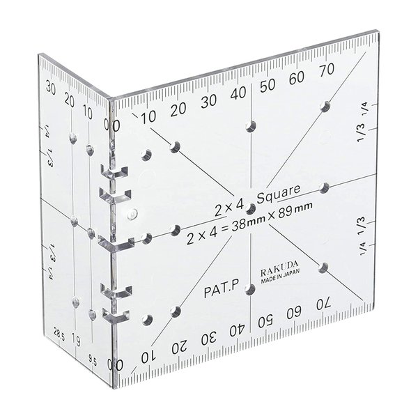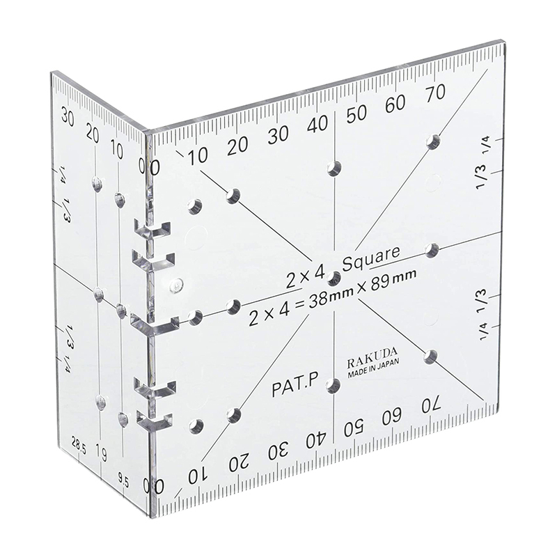 のこぎり切断前の45度の線引き、2X4・1X4材の各面の中心線引き、2X4・1X4材の枠組みや棚組みの際の材料位置決め線引き、二分割・三分割・四分割の組継ぎの線引きができます。
