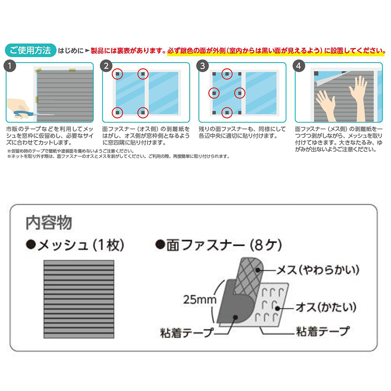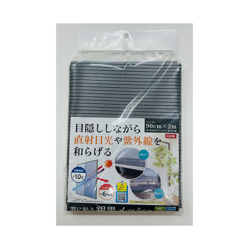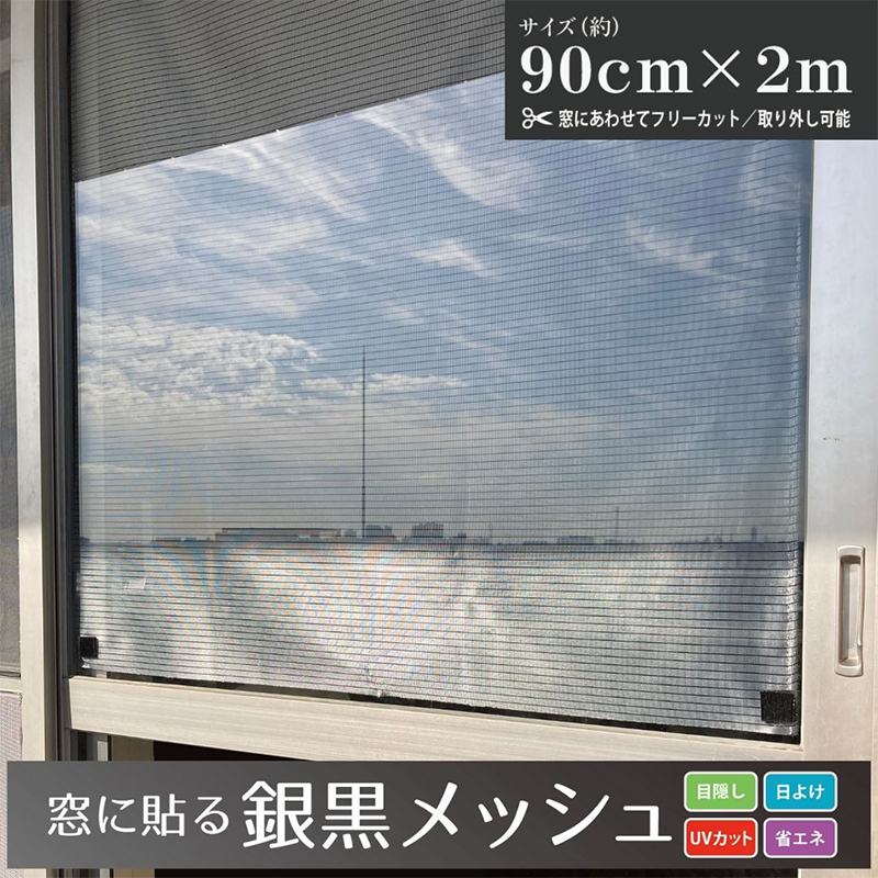 「窓に貼る銀黒メッシュ」は、粘着テープで簡単に取り付けられる目かくし・省エネ用メッシュです。