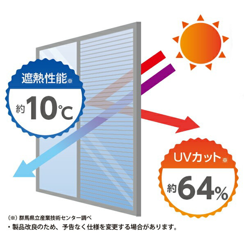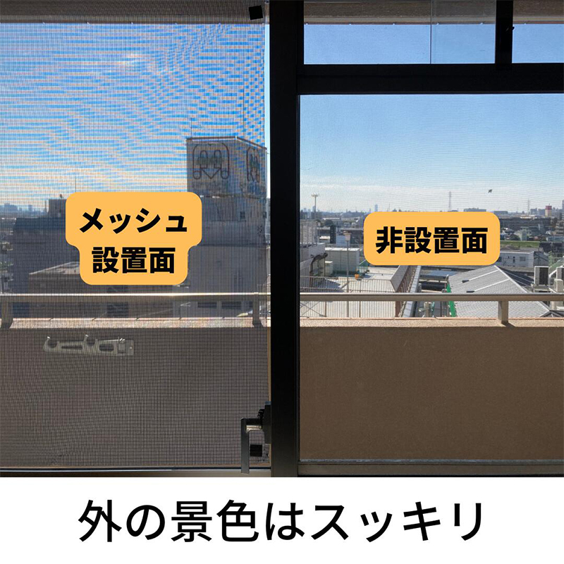 光沢糸による特殊メッシュが生み出す、表が銀で裏が黒の「銀黒目かくし効果」で、室内からは外の確認が可能な程度の視界を残しつつ、日中は室外からの視線を遮ります。