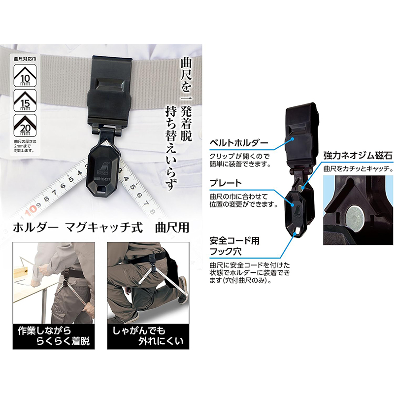 ●しゃがんでも曲尺が外れにくい設計です。