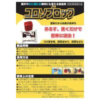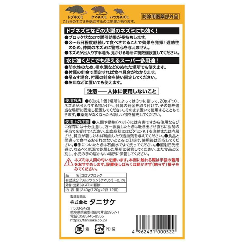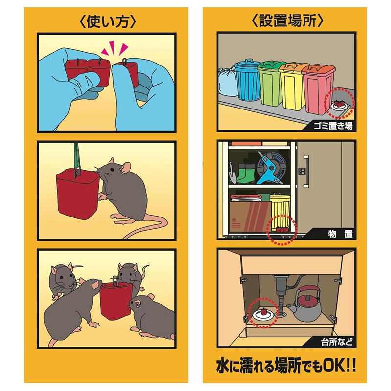 ・60gを1個(場合によっては3つに割って20gずつ)、ネズミが出入りするものかげへ付属の針金を取り付けて、その端を適用な場所に固定して配置します。そのまま置いて使用することもできます。