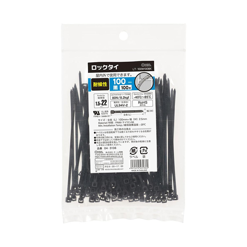 オーム電機 ロックタイ 耐候性 100mm 100本入 黒 結束バンド LT-100W100BK メール便対応(4個まで) 4971275431362