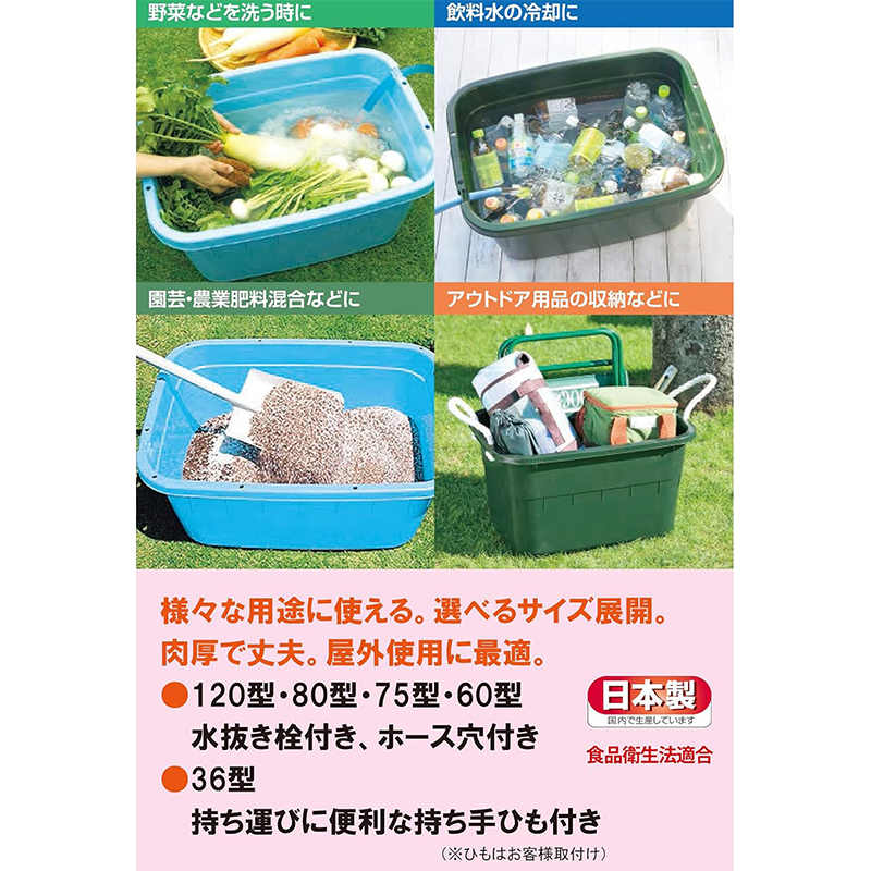 野菜などを洗うとき、飲料水の冷却に、園芸・農業肥料混合、アウトドア用品の収納などに