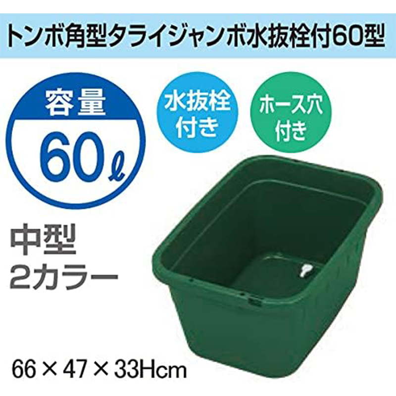新輝合成 トンボ タライ 60リットル 角型 水抜き栓付き ホース穴付 モスグリーン 幅66×奥行47×高さ33cm 日本製 4973221022006