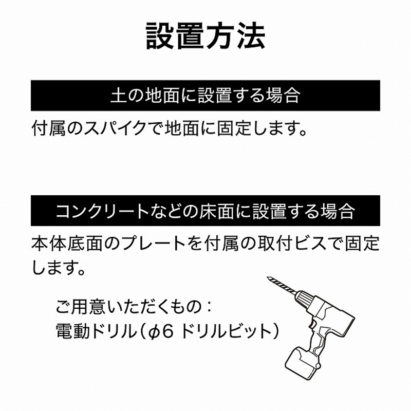 付属品:専用スパイク1本(高さ:約16cm)、取り付けビス2本、取り付けアンカー2本、六角レンチ1本