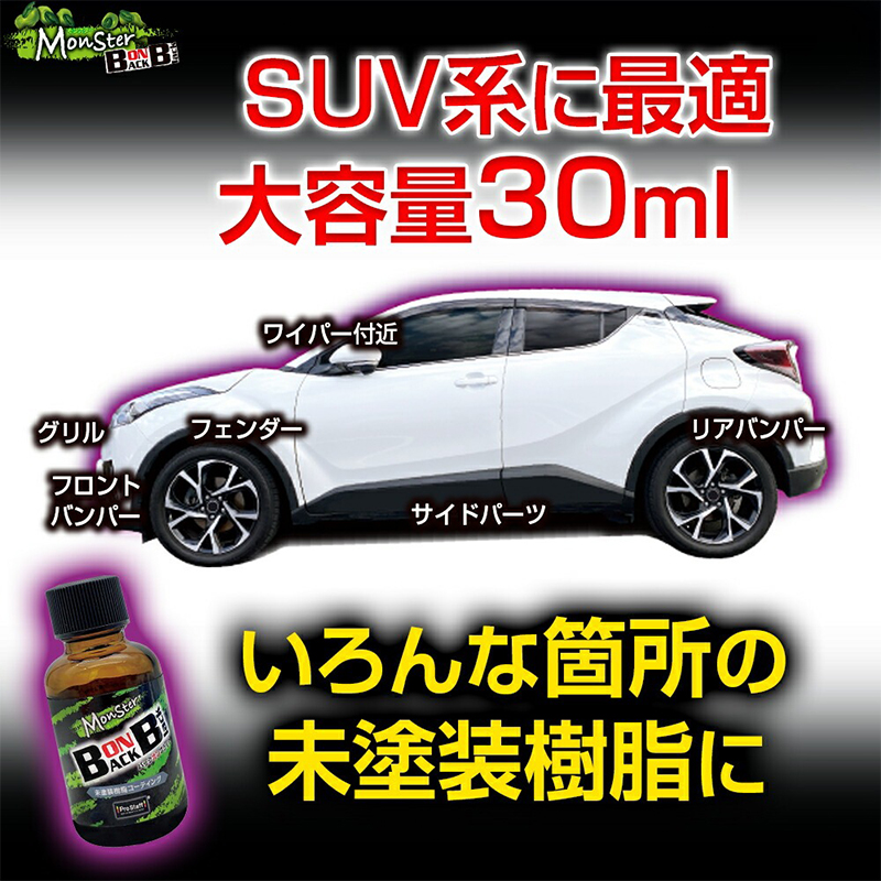 たっぷり30mlの大容量。未塗装樹脂パーツの多いSUV系も安心して使用できます。