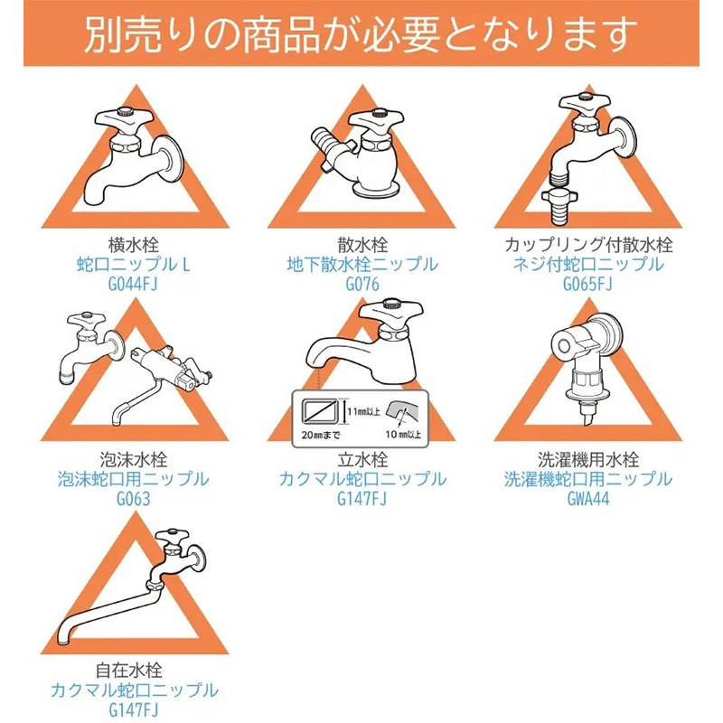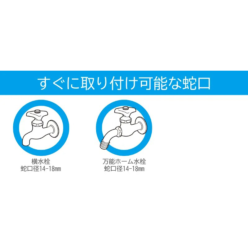 ●蛇口外径が14〜18mmの横水栓または万能ホーム水栓に適合するニップル付きです。