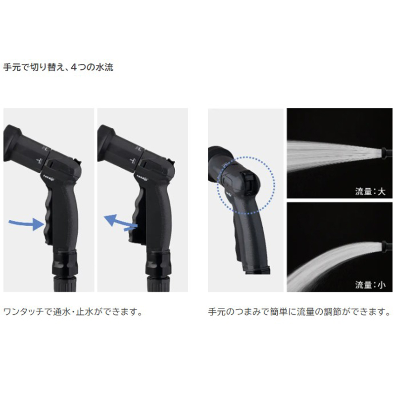 ●4水形切替で流量調整可能な散水ノズル付きです。