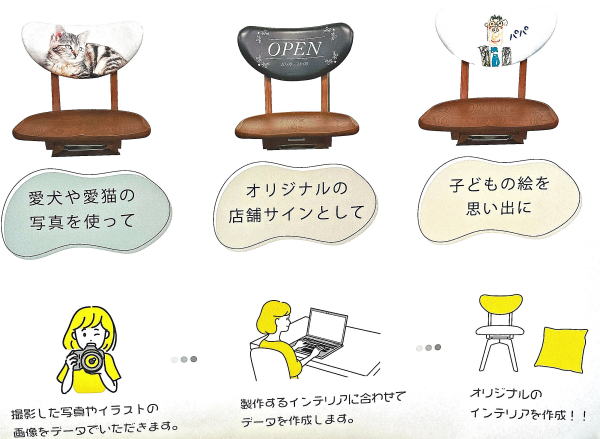あなたのお気に入りの写真やイラストであなただけのPVCレザーを作り、それを使って椅子やクッション・キューブなど作ってみませんか。