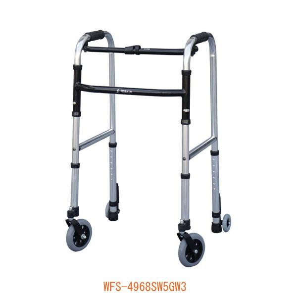 ・前輪5インチ、後輪3インチのキャスター付歩行器。