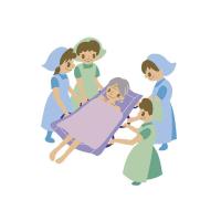 ・介助者の腰痛予防のため4人で保持する移動ネット。